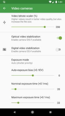* The default exposure mode is "shutter priority", which manually controls the used exposure times and sensitivities to be within certain custom ranges that can be set in the settings (e.g. to limit motion blur). The default settings of this exposure mode are trimmed for well lit environments (like outdoors), so the settings may need to be increased for indoor environments if you are getting DARK VIDEOS.