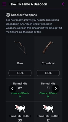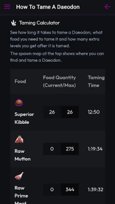Don't just survive—thrive! Calculate the resources needed to tame any creature, with detailed stats on food, narcotics, and time required.