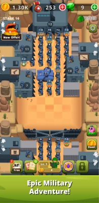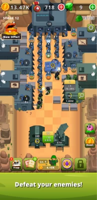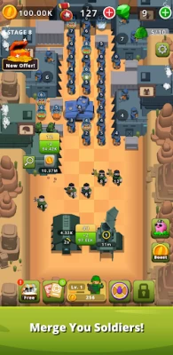 This is an idle merger tycoon game about building your small military into an empire. Hire soldiers to defeat enemy troops, collect resources, unlock factories, and upgrade your military base.