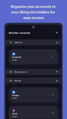 - Create folders to organize your TFA accounts to your convenience. You can create and reorder personal and work folders separately for easy access. You can also move accounts within and in between folders.