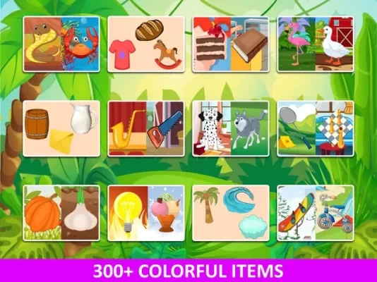 Games include such concepts and objects as: - Animals and birds - Food, toys, clothes - Hot and cold - Instruments - Much more