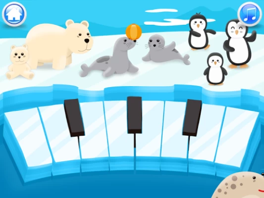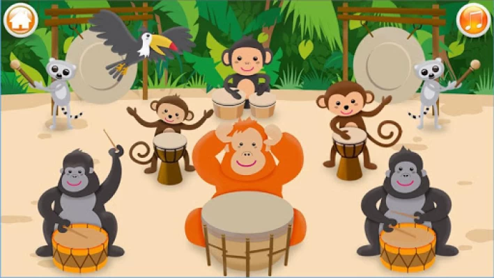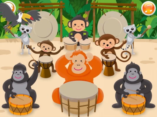 Play the piano, xylophone and drums in different animated scenes.