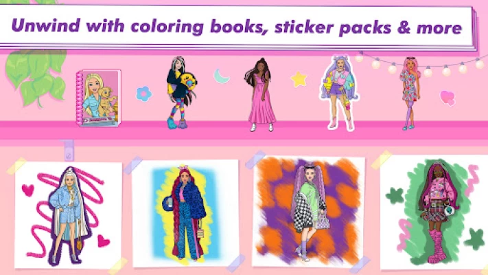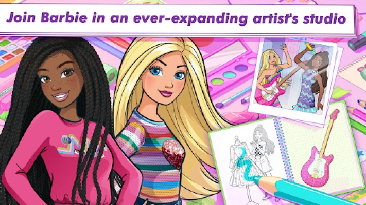 Join “Brooklyn” and “Malibu” on a colorful adventure in painting, sketching, designing and more! Explore an ever expanding bedroom of coloring books, tools, designs, locations and items. Bring Barbie’s memories to life with creative design challenges. Embark on a creative journey by customizing items and characters from your favorite Barbie movies and series, then save your designs as stickers and play with them in 2D locations. Earn unique rewards for completing design stories, and use them to decorate your personal studio. Download any drawing as an image to your device, so you can show it off to your friends and family.