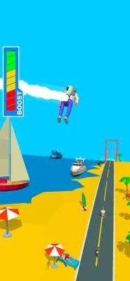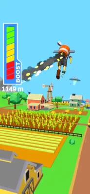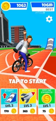 Tap to speed up your BMX and jump off the high ramp as far as you can go. Use the jetpack to boost the jump and cover more distance! The further you travel, the more rewards you get!