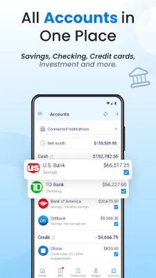 Manage all your financial accounts in one place with TimelyBills. Link your savings, checking, credit cards, and investments accounts to have a comprehensive view of your finances.