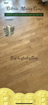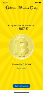 In this fun game you play with the concept of mining Bitcoins. It's an AR game where you can play that you produce real Bitcoins in your room. You have an Augmented Reality view into the room you're in when playing and when you tap on the Bitcoin-coin virtual Bitcoins drop from above.
