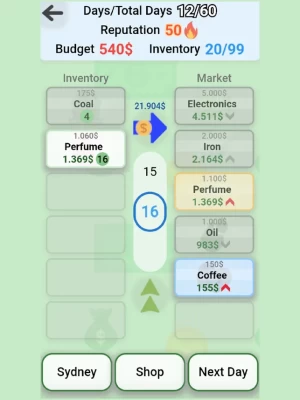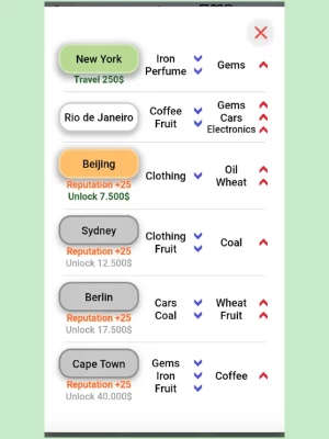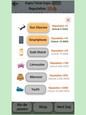 Buy cheap products from the market and sell them more expensive. Wait until the next day or travel to another location to find a better price and make a profit. Buy a yacht or a mansion to increase your reputation in the world.