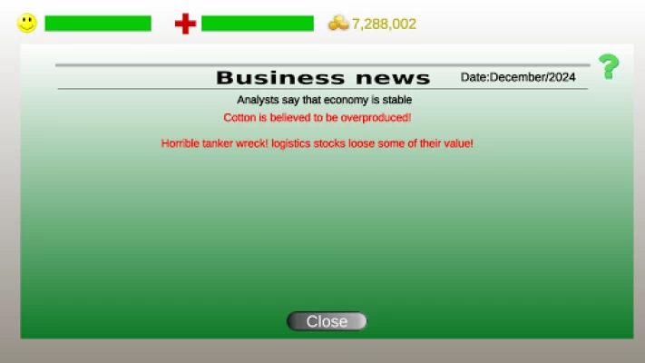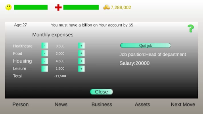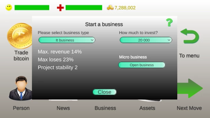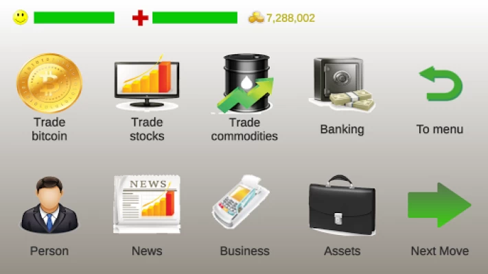 The game is free, without registration and demo accounts. Keep track of the economy and news, find undervalued assets and choose the right moment for investment. Meet the vital needs of the character to avoid depression and health problems. Work as an employee, or start your own business - the choice is yours! Start a business in different industries, with varying degrees of risk and return. Choose your strategy on the way to a billion - from cautious short-term investments to the wide and bold use of credit funds. Game features: -easy and addictive gameplay -without registering - path from clerk to billionaire - completely free (purchases do not affect the game balance)