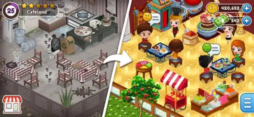 Don't Be Good, Be Great! Decorate and design the place of your dreams in this cooking madness! Prepare delicious desserts, burger, pizza and drinks, cook tasty food to keep your customers happy - From the creators who brought you facebook Cafeland game, it’s a fun-tastic new cooking game!