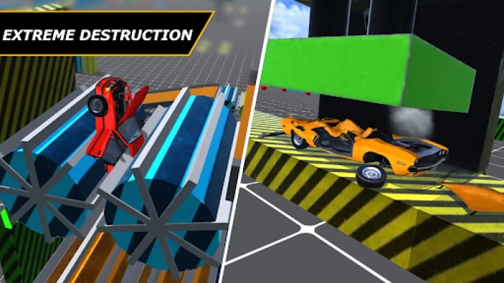 The obstacles and elements to smash the vehicles that you will find on the map are very varied: very long ramps where you can make incredible jumps where each jump ends in a different way (crashing into a wall, falling down a cliff full of bars, falling to the ground, etc.), perform impressive loops, submit the cars to the pressure of hammers or crushers, dodge or crash against rotating balls and sticks or pass your car through the different crushers you will find, each one more dangerous than the previous one.