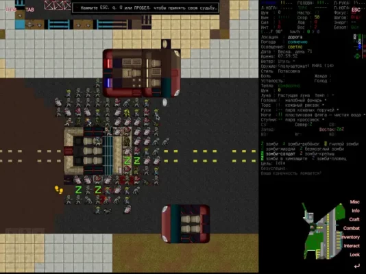 Cataclysm: Dark days ahead and Cataclysm: Bright Nights are turn-based survival games set in a post-apocalyptic world. Struggle to survive in a harsh, persistent, procedurally generated world. Scavenge the remnants of a dead civilization for food, equipment, or, if you are lucky, a vehicle with a full tank of gas to get you the hell out of Dodge. Fight to defeat or escape from a wide variety of powerful monstrosities, from zombies to giant insects to killer robots and things far stranger and deadlier, and against the others like yourself, that want what you have…