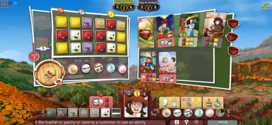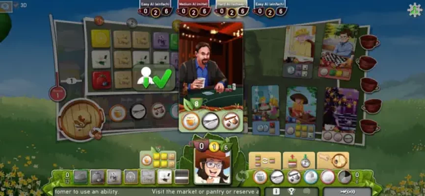 Each turn you can choose either to visit the tea market, the pantry or to reserve a customer and use an ability.