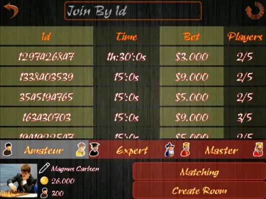 • Create chess room with money bet and game time and max players that you want to challenge your friends.