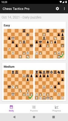 This tactic trainer lets you practice in 3 different modes: - Solve daily puzzles - Solve offline puzzle packs - Use the "Progress" mode to get random problems of your level and know your Elo rating