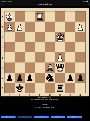 A unique feature of Chessvis is the "Visualized" puzzle. It presents a puzzle showing the diagram from some number of moves before the actual tactic sequence starts. You're told the number of moves to "visualize" and then solve the problem from a board position that only exists in your mind. This is what got Chessvis started and it’s the only app with it.