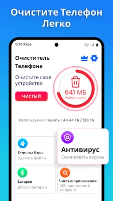 Используйте функцию отчистка телефона и очистка мусора на андроид приложение , чтобы очистить кэш файлы и освободить свой телефон от временных и нежелательных файлов. Клинер для андроид приложение также помогает вам отчистка телефона от вирусов не внося никаких изменений в ваше устройство.