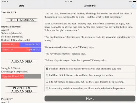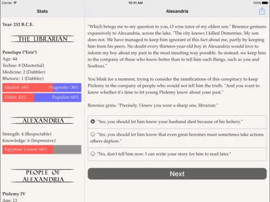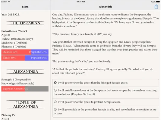"Choice of Alexandria" is an interactive novella by Kevin Gold, author of "Choice of Robots." Your choices control the story. It's entirely text-based--90,000 words, without graphics or sound effects--and fueled by the vast, unstoppable power of your imagination.