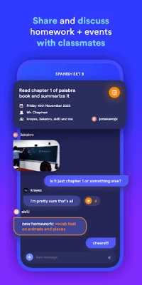 Our new class group chat feature, Classroom, allows you to share your homework, clubs and events all in one click. When you’re in a Classroom and a classmate shares one of these to the group chat, it will automatically be added to your planner, details and all! Organisation without effort.