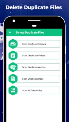 The storage cleaner app can scan and delete many types of duplicate files such as duplicate images, duplicate videos, duplicate audios and other duplicate files.