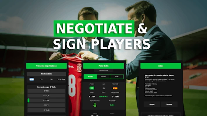 - Sign players for your squad using the transfer market. Negotiate with them to get the best deal for your team.