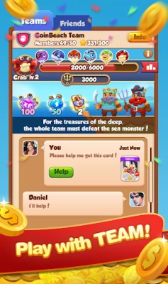 Play in team with your teamates. Get free spins and cards with the help of teamates. And finish the tasks together to beat other teams to get the big rewards!