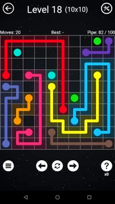 The game presents Numberlink puzzles: each puzzle has a grid of squares with colored dots occupying some of the squares. The objective is to connect dots of the same color by drawing 'pipes' between them such that the entire grid is occupied by pipes. However, pipes may not intersect. Difficulty is determined by the size of the grid, ranging from 5x5 to 14x14 squares. The game also contains a time trial mode.