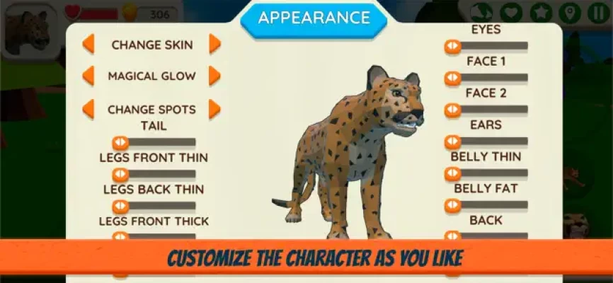 Customize the appearance of the cougar as you like. There are several skins to choose from. If desired, your pet may look like a panther, a jaguar, a cheetah, a leopard or another bright and beautiful big cat. You can adjust the magical glow of a cougar or add spots like a leopard to make the animal look even more impressive. For a more accurate setting, you can change: tail, eyes, ears, belly, neck, legs and back. Let your animal look the way you like.