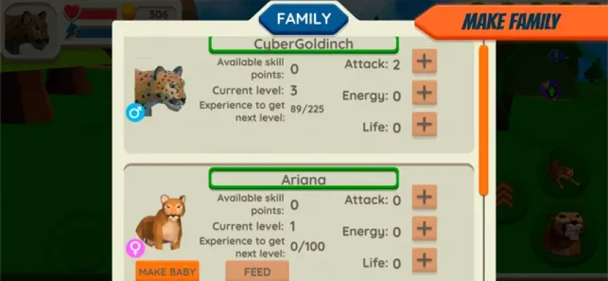 You can create a family if you find another cougar. When you create a family and become an experienced cougar, you will be able to make babies. Your family can help you in combat and hunting. There is an opportunity to improve the characters of the family. To do this, it is necessary to hunt and collect food in order to feed the children and the wife (the husband, for the female character) in the future.