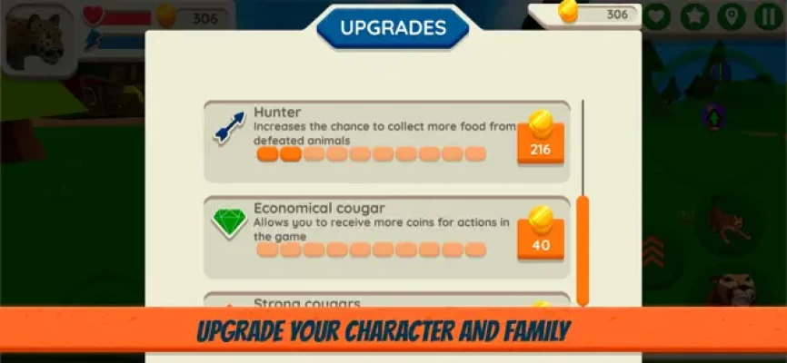 The game has the ability to improve the individual characteristics of family members and characteristics that affect all cougars in the family at once. Do not forget to improve the characters! Get experience doing tasks and hunting. After receiving a level, the character can spend it on points of attack, energy or life. There are also special skills that allow you to increase speed, collect more food, get more resources for actions in the game, etc.