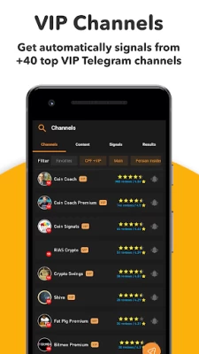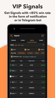 ‣ Crypto signals: join channels and see reviews for each channel; set crypto signal notifications for each group; content, signals & results.