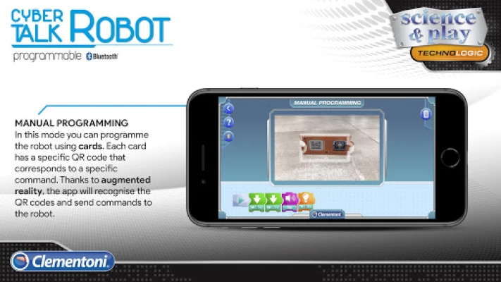 The package includes 16 cards corresponding to 16 commands, each with a different QR Code. After the command sequences have been created by manually arranging the cards side-by-side, thanks to augmented reality, the app will be able to read all the codes and recreate the sequence digitally, before sending it to the robot for its execution.