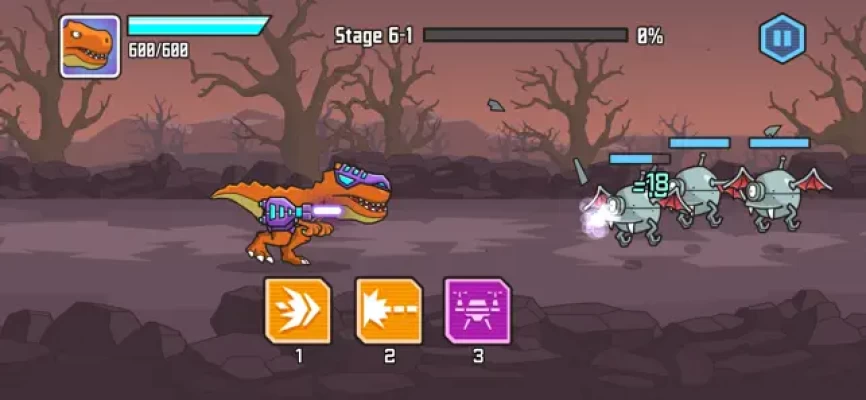 AttackThe first thing you’ll do in CyberDino is attack. In attack mode, you roam through a series of battles against robots. You have 3 abilities to use with your default attack. There are 4 separate regions, each new place bringing tougher enemies, and a final boss at the end.