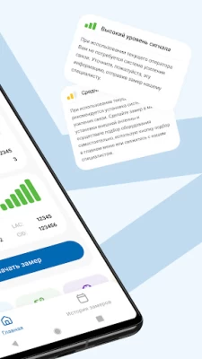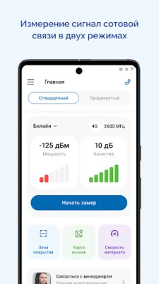? Наличие «стандартного» режима для определения основных параметров сигнала сети: Стандарта сети, мощности сигнала, качества, частота канала сотовой сети. ? Понятный алгоритм получение замера сигнала и удобная его отправка специалисту для детального анализа