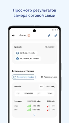 ? Построение визуальной карты объекта, для определения зоны установки активного и пассивного оборудования. ? Приложение поддерживает стандарты сотовой связи для всех операторов: 4G, LTE, HSPA+, HSPA, 3G, UMTS, EDGE, 2G, GSM