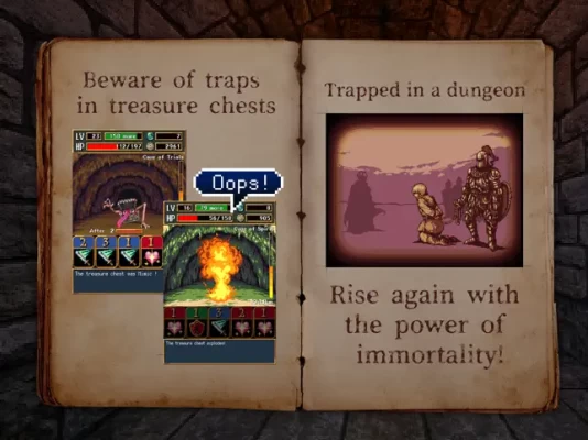 Dungeons are not only horrific monsters. Suspicious dead, hidden traps, dangerous treasure chests, you have to identify them. Can you use wisdom to survive in the dungeon?