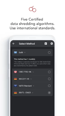 CB Innovations android data eraser app is made in Germany. The secure eraser app comes with secure erasing methods such as the NATO (North Atlantic Treaty Organization) standard, the German BSI-2011- VS & German BSI TL-03423 as well as the Canadian CSEC ITSG-06!