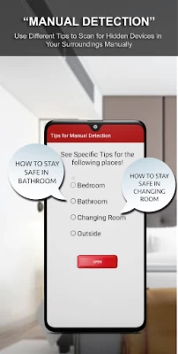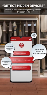 Open the feature named Detect by using magnetometer in the app, then move your phone in your surroundings. The app will show a message that potential electronic device nearby, if this happens then check the area manually for any spy bugs. Mostly holes or gaps in the corners, such as bedside lamps, drawer locks and stuffed toys can be used to hide electronic devices. This feature may also be used as a bug detector scanner to scan the surroundings for potential electronic bugs.