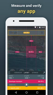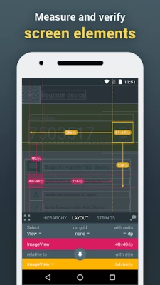 Designers, testers and developers can finally check size and position of various elements presented directly on the mobile device. Did you ever wonder what is the exact distance of a given button to a given text label on a particular device? Or maybe, what is the size of a particular element in density points? Developer Assistant provides a toolkit to help verify and satisfy requirements from designers like the pixel or rather the DP perfect design.
