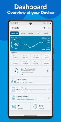 ? Dashboard: Overview of your device's software and hardware info, including RAM, Internal Storage, External Storage, Battery, CPU, Sensors Available, and Apps Installed.