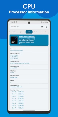 ?️ CPU: Display all details about the System on Chip(SoC), Processors, CPU Architecture, Supported ABIs, CPU Hardware, CPU Governor, Number of Cores, CPU Frequency, GPU Renderer, GPU Vendor & GPU Version.