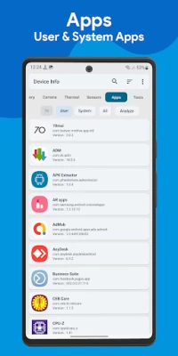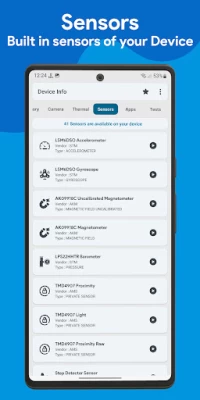 Device Info is a user-friendly mobile application that provides comprehensive information about your device's hardware and software. You can monitor real-time data on your device's CPU, GPU, RAM, OS, Sensors, Storage, Battery, Wifi, Bluetooth, Network, Apps, Display, Camera, and Thermal performance. Additionally, you can use device Info/ phone Info to run hardware tests and benchmark your device.