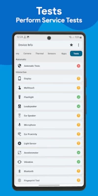 ☑️ Device Tests : Benchmark your device with the following tests: Display, Multi-touch, Flashlight, Loudspeaker, Ear Speaker, Microphone, Ear Proximity, Light, Accelerometer, Charging, Headset, Vibration, Bluetooth, Fingerprint, Volume up button, and Volume down button.