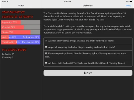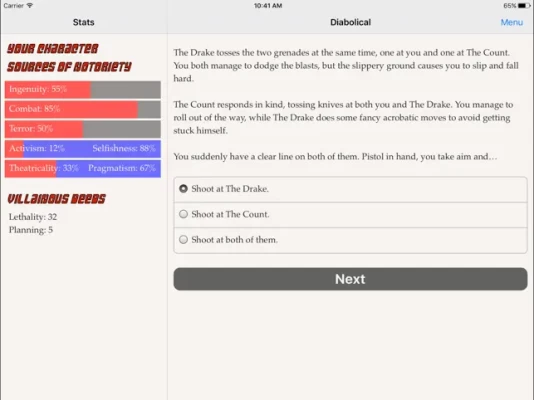 "Diabolical" is a 130,000-word interactive novel by Nick Aires, where your choices control the story. It's entirely text-based--without graphics or sound effects--and fueled by the vast, unstoppable power of your imagination.