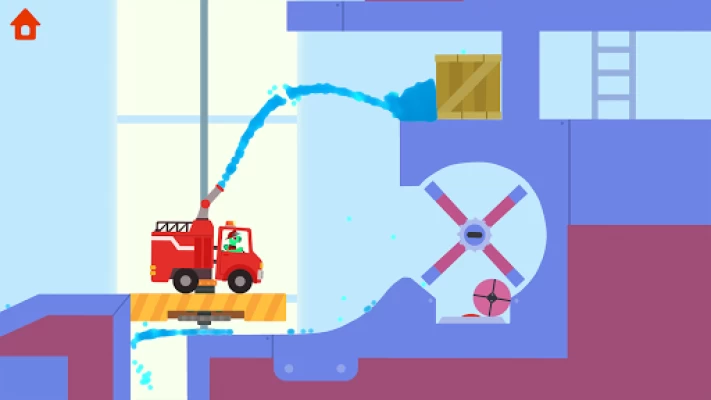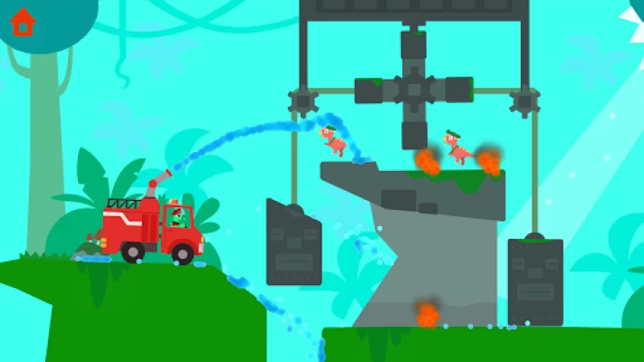 Some of the fires are hard to reach, so the angle of your fire hose is critical. Kids might even have to shoot the water upwards and let the water flow down to put out the flame. Sometimes, kids need to use the collision between the water and other obstacles to change the direction of the water flow to save the dinosaurs.