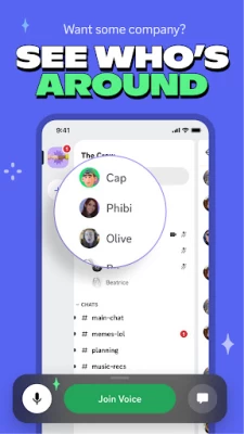 • Voice channels make hanging out easy. Got a free moment? Grab a seat in a voice channel so friends can see you’re around and pop in to talk without having to call. You can even watch videos together!