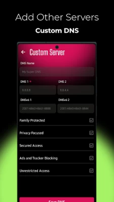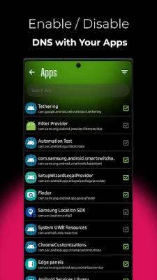 Custom DNS Settings: You can also enable or disable specific apps with your selected DNS server.
