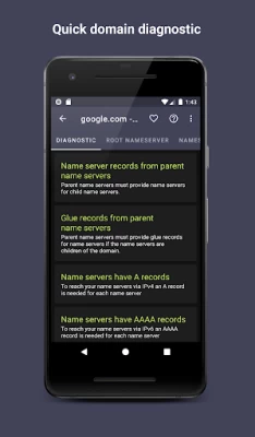 DNS Hero let you inspect DNS zones easily. This app will give you information about the root nameserver, nameservers associated with the domain and various other DNS records (A, AAAA, MX, CNAME, TXT, SOA). You can also view the domain health as a diagnostic is run.