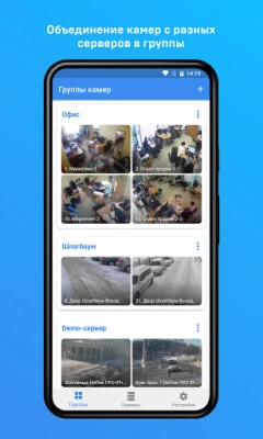 - Объединение камер с разных видеосерверов в группы.
