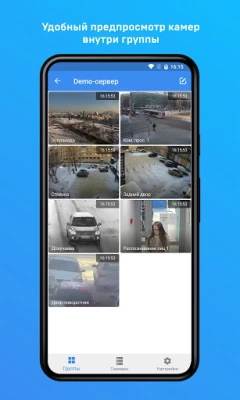 Интуитивно понятный интерфейс приложения позволяет создавать группы камер, оперативно переключаться между камерами и группами; осуществлять просмотр видео, как в реальном времени, так и в архивном режиме; управлять поворотными камерами; прослушивать звук.
