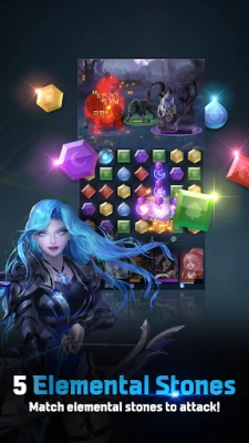 Play match 3 puzzles filled with various elements of Flame, Ice, Nature, Light, and Dark.